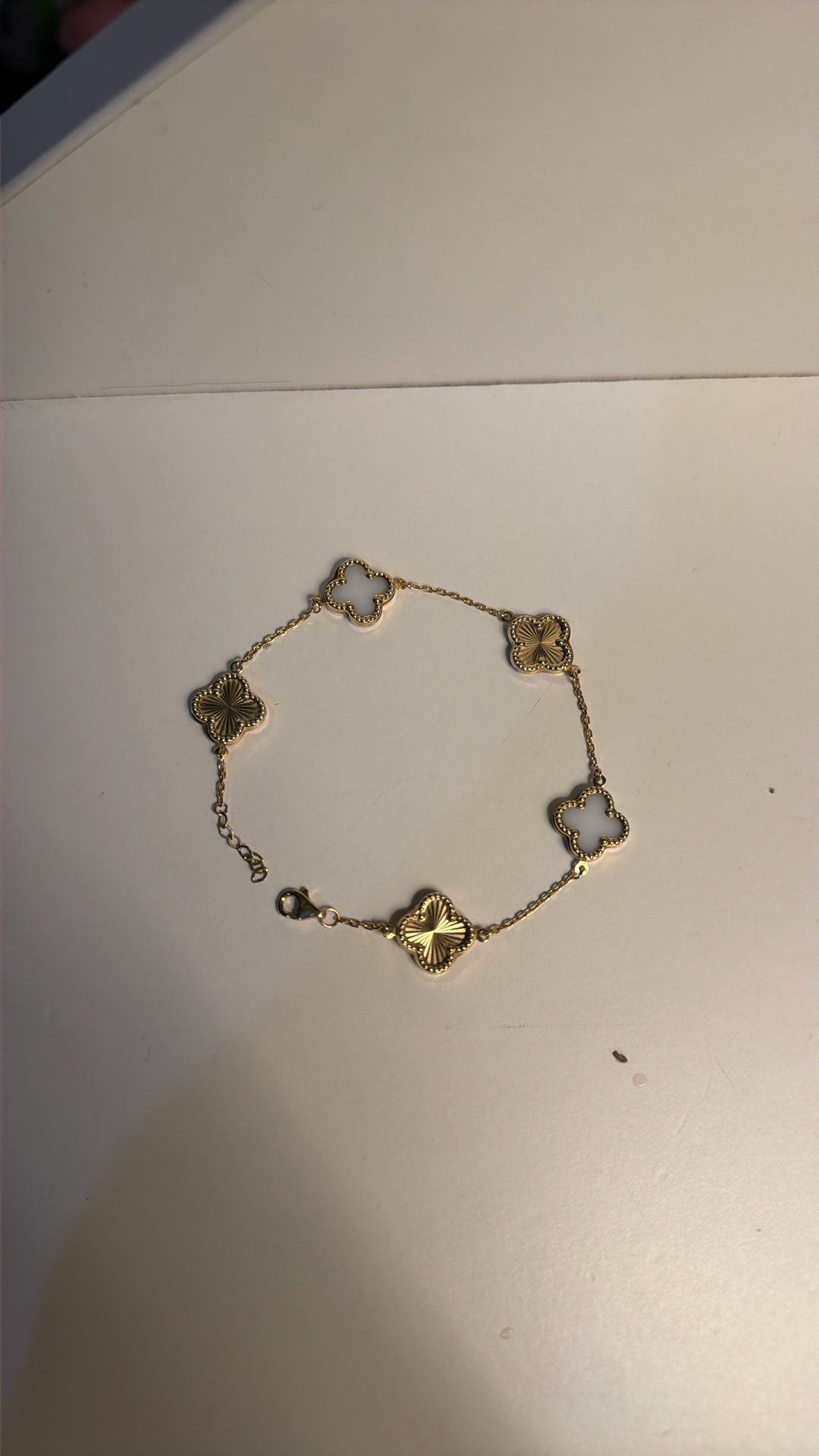gold clover bracelet real gold- 14k i bought it for $600 one of the clovers has a small dent that’s why i lowered the price but other than that its in great condition, hardly worn. let me know if you would like a picture of the dent!