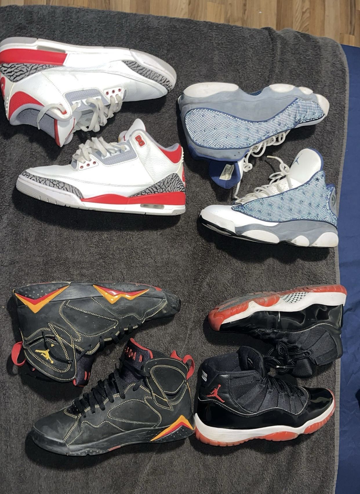 🚨100$ EACH ‼️🚨 Bred 11s Size 11- $100 Flint 13s Size 10 $100 Fire Red 3s Size 11 $100 Citrus 7s Size 10.5 $100