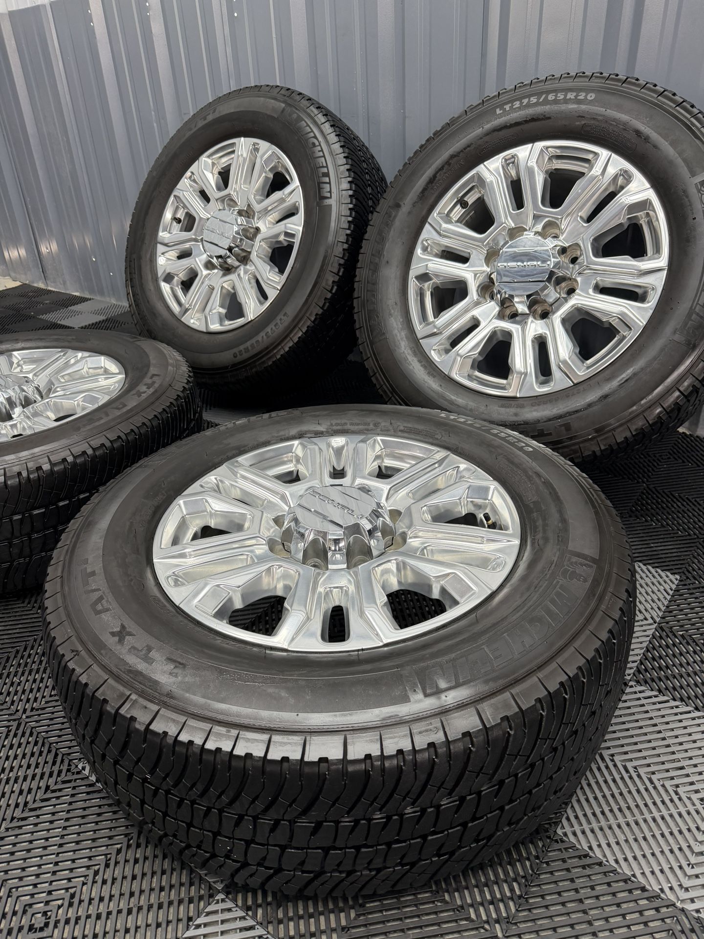 20" GMC Sierra OEM 2500 Denali wheels and tires -These wheels and tires will make your truck look amazing! -Tires are 275/65/20 Michelin two are better than the other two -LT 10 ply load range E -TPMS sensors and lugs not included 8x180 Bolt Pattern FITS: Chevy Silverado, GMC Sierra 2500 and 3500 ONLY FITS 2011 and newer: 2011, 2012, 2013, 2014, 2015, 2016, 2017, 2018, 2019, 2020, 2021, 2022, 2023, 2024, 2025, 2026