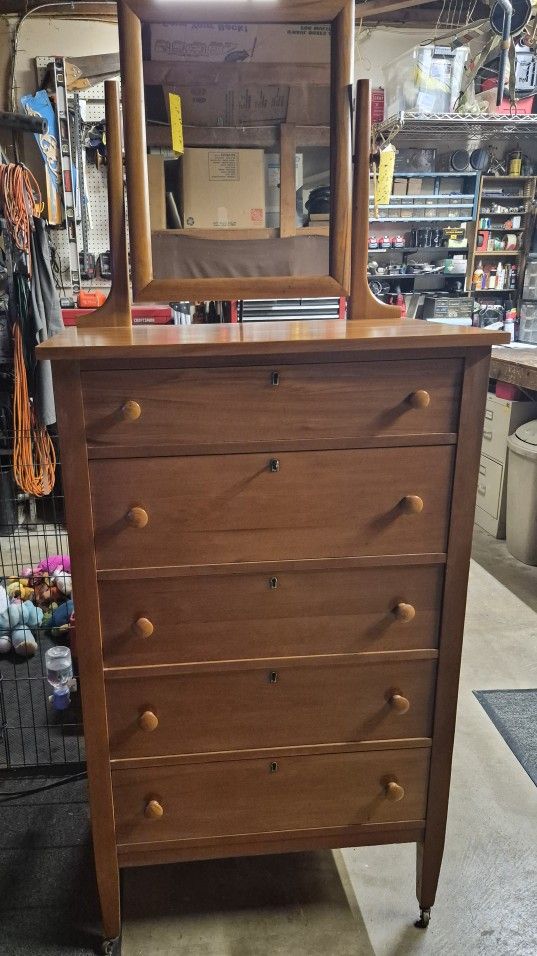 Antique tall/high dresser with five drawers, mirror and on wheels. All dovetail drawers slide easily. Also with key. 30 in wide X 20 inch deep X 50-in tall. 75 in tall with mirror. Located in Riverside