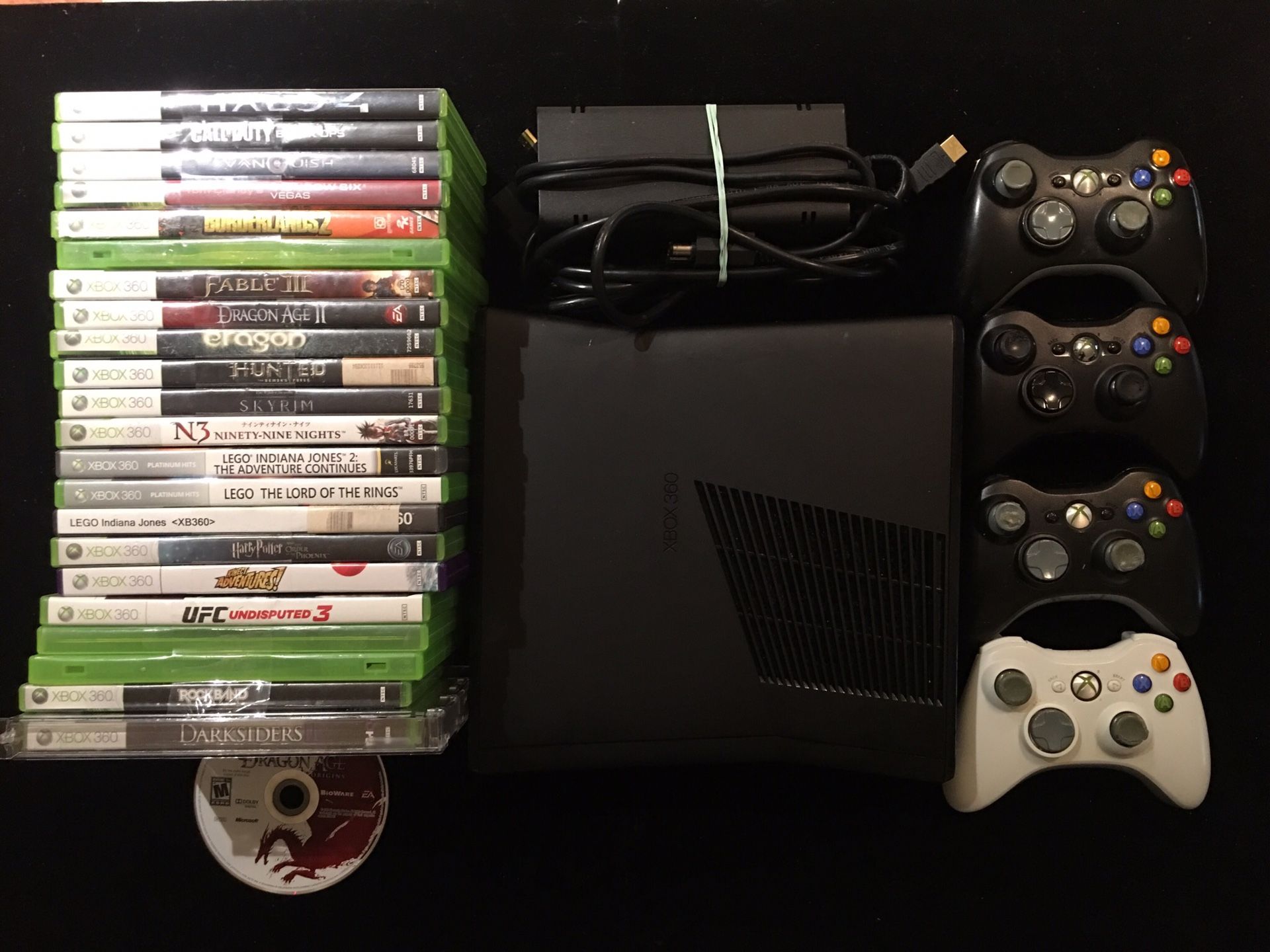 Microsoft Xbox 360 S Black Console+ 23 Games+4 Controllers+All Cords+ NO HHD (Post Nintendo era)