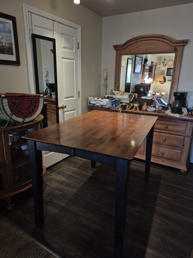 Downsizing and don't need this set anymore. Solid wood dining table with built in leaf + 6 chairs. One of the table legs is short a double ended threaded dowel screw and washer. A couple of imperfections on the chairs and small paint spill on the table. Must pickup.