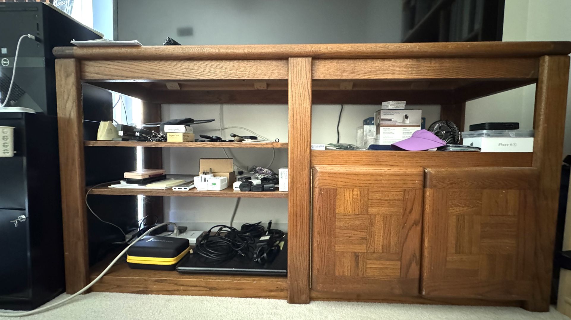 Solid Oak, very sturdy with 2 open doors 64” Length 19” Depth 33.5” Height