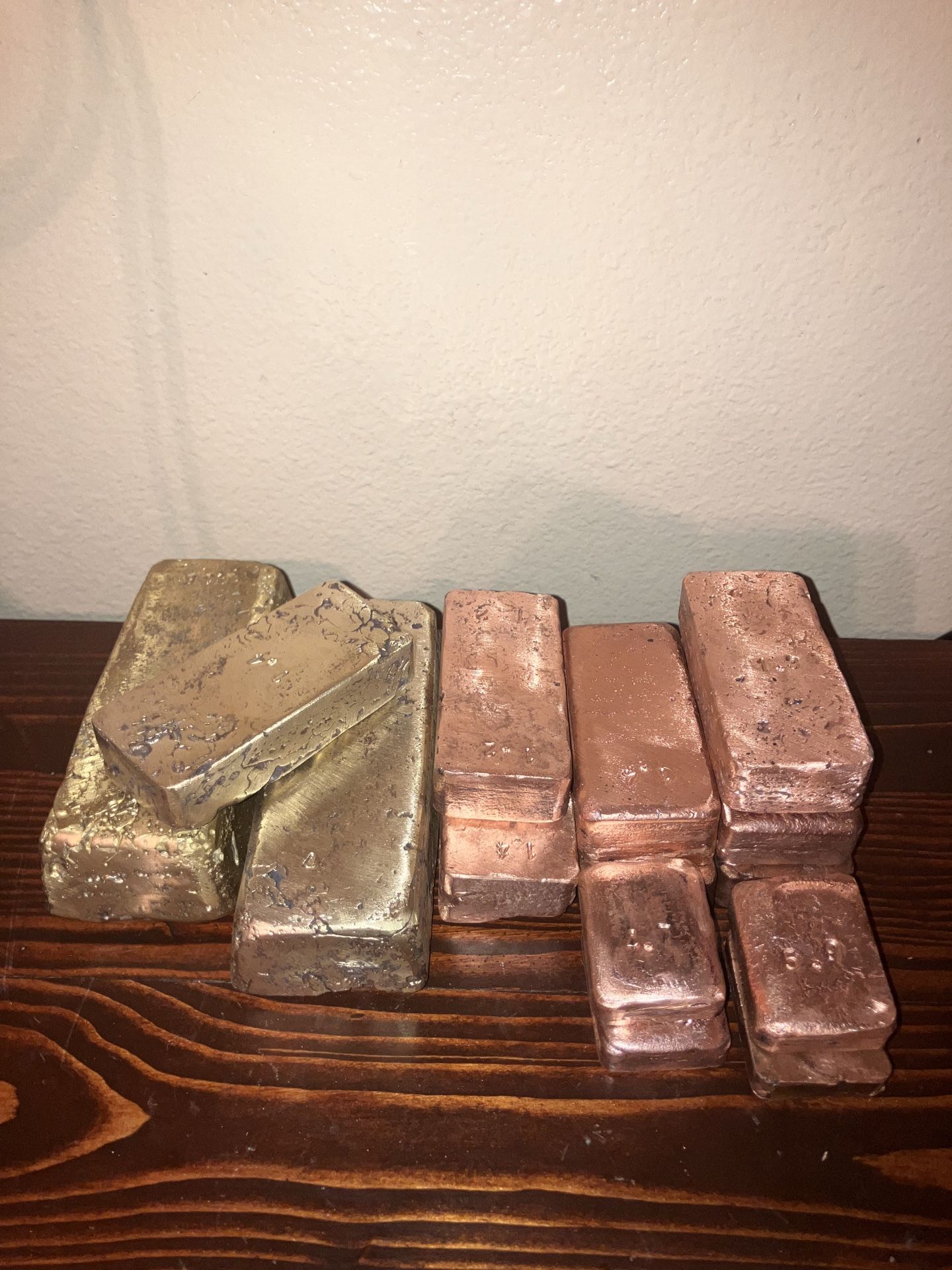 .999 hand poured copper bars $20/lb. Smaller bars have premium price $3/oz. Brass bars, $10/lb. Discounts for bulk purchases.