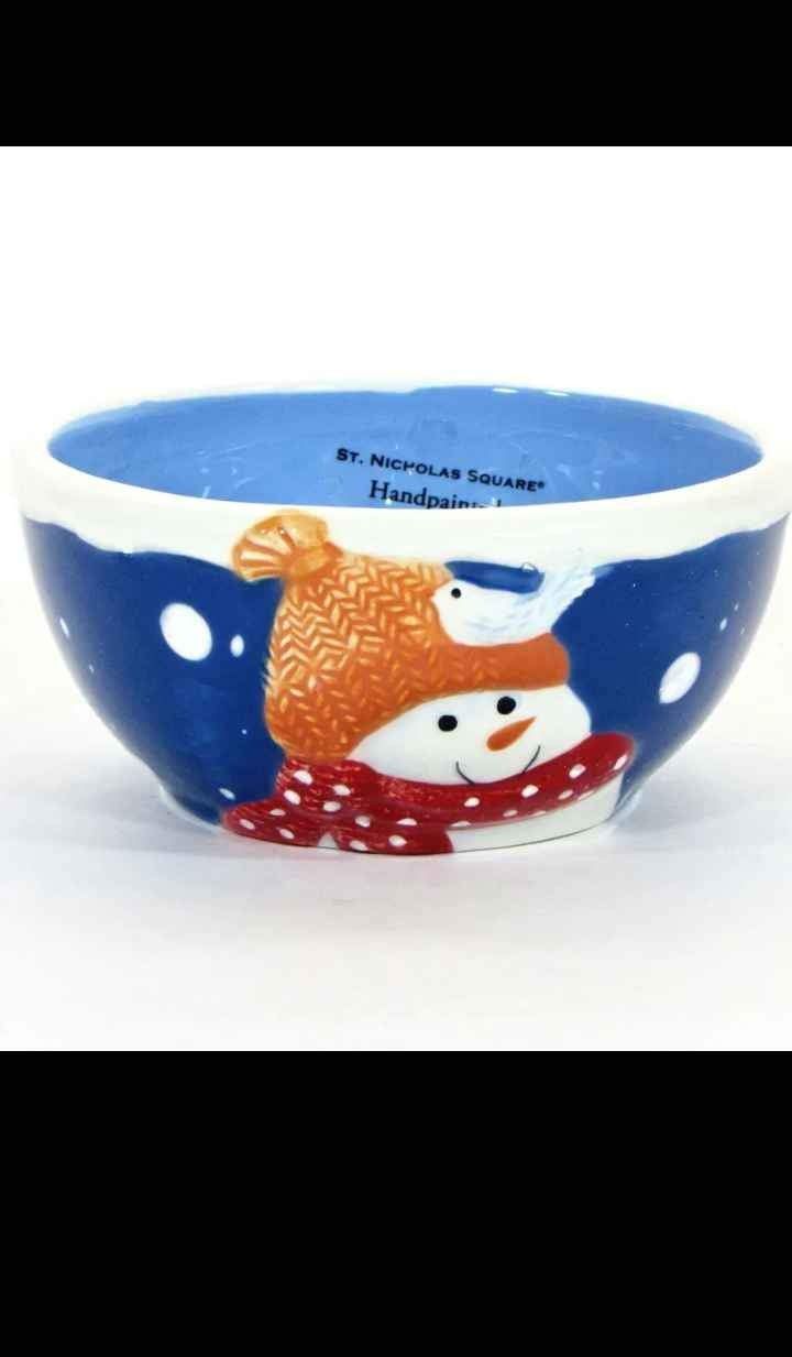 For Your Consideration is this Beautiful Holiday Bowl from St. Nicholas Square. Bowl is from the St. Nicholas Square Snow Days Collection, and is retired and rare. Bowl is skillfully handcrafted ceramic and beautifully hand painted with white snowflakes and an embossed snowman in a red hat and orange scarf. Bowl has the capacity to hold 8 ounces (to the rim) of your favorite holiday dessert, hot breakfast cereal, or snack. Bowl measures approximately 4.25"DIA x 2"High. Bowl is dishwasher safe and microwave proof, but not intended for oven use. Bowl is sold in excellent condition and will be gently handled and carefully packaged