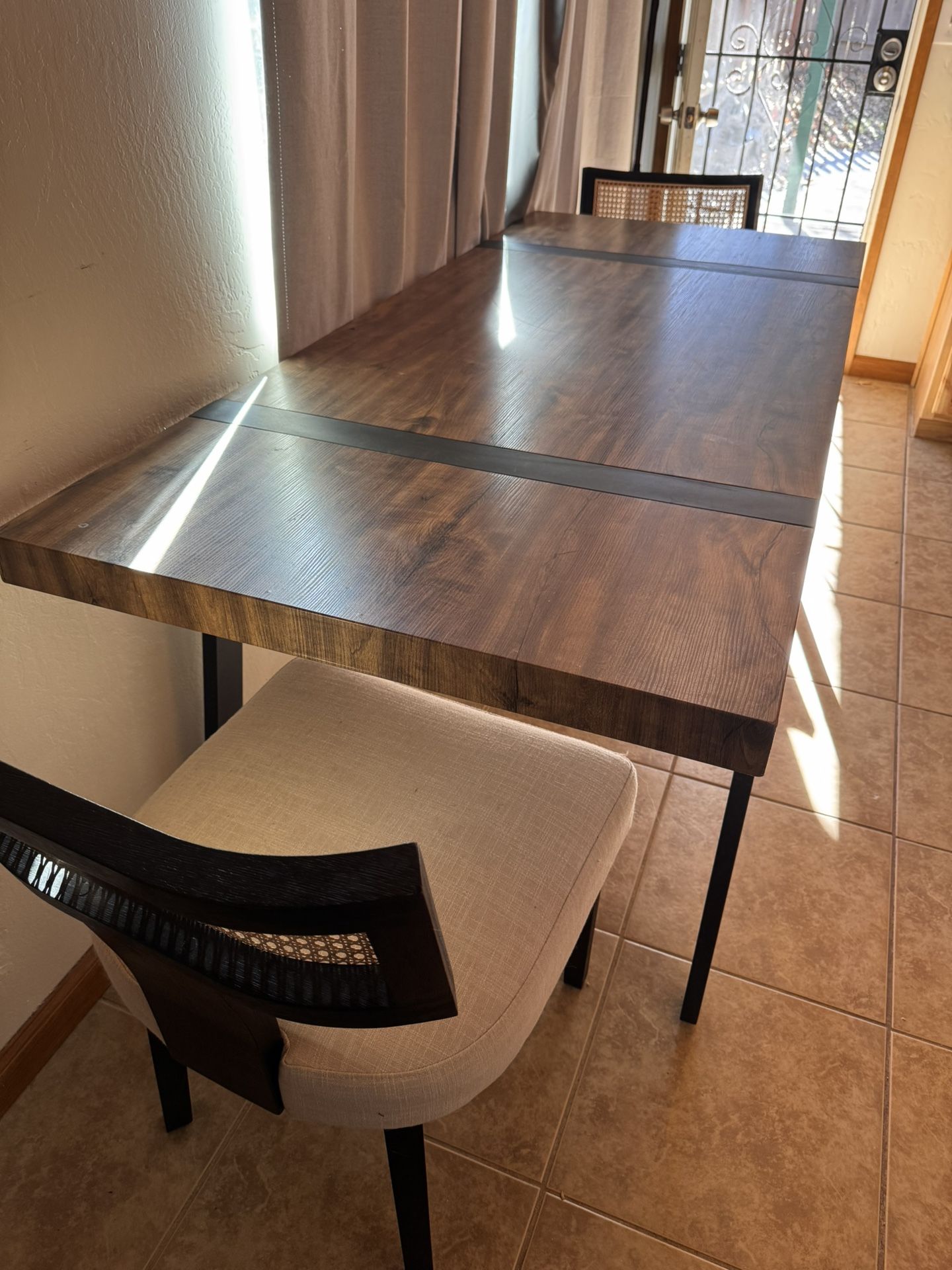 Table is wood and metal very sturdy with cloth and wood chairs. Like new, already deconstructed for easy move. Must come and get.