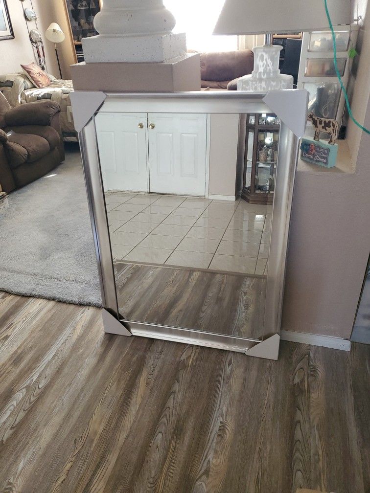 48" x 36" Makes a nice gift! Great Size for Living Room or Large Bathroom. Could use 2 of them with a 72" Vanity. Still wrapped in bubble wrap with the protective corner pieces. Mirror is beveled at the edge. Gives a nice high end look. Has some weight to it. Not cheaply made. Frame is Silver with a brushed appearance. See pics. I have 4 available. $50 each