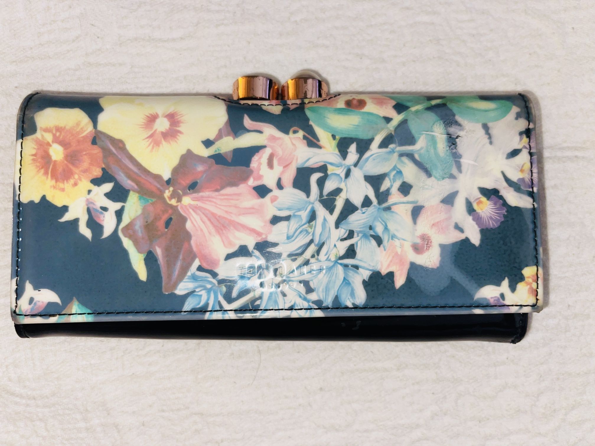 Women’s ‘Alsori’ patent black leather purse with an all over floral print from Ted Baker. The fold over purse opens up to reveal a leather lined interior with multiple note compartments, card slots and an ID pocket. Complete with rose gold-tone metal details, jewel and pearl embellishment to the top and a zip coin pocket to the reverse. Outer: Patent Leather. Lining: Polyester. Dimensions: H: 9cm x W: 18cm x D: 5cm there’s a small blemish on the back of the wallet as seen in the photos and a small tear where the ID card insert is as see in the photos. Priced accordingly. Retail $139