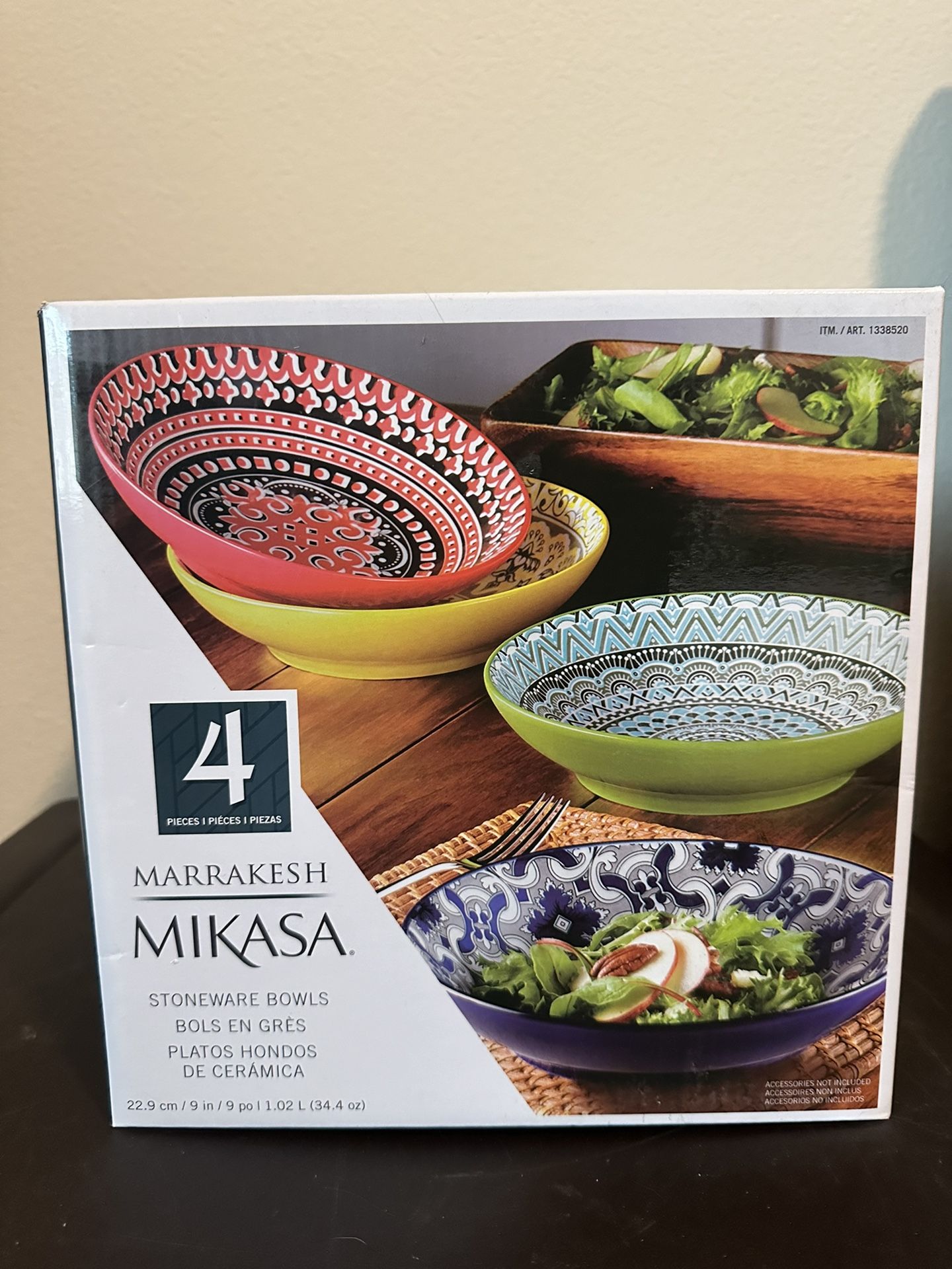 New in box Mikasa Stoneware 4 piece pasta bowls. Each are 9 inch in width. And 34.4 oz capacity. The pattern is called Marrakesh. Model # (contact info removed). Dishwasher and microwave safe. This brand sells for $69 on other sites.