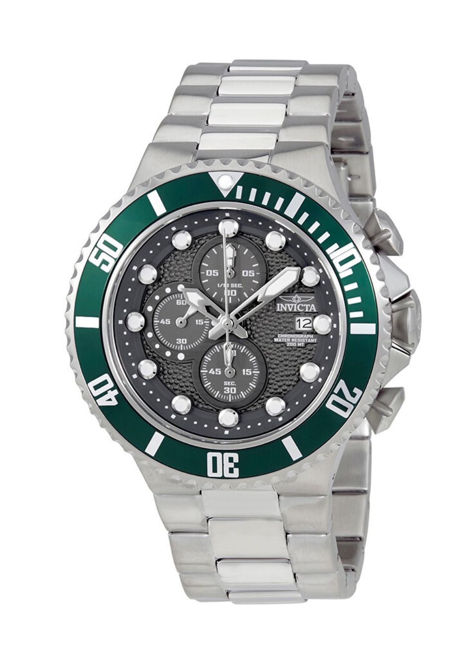 Stainless steel case with a stainless steel bracelet. Uni-directional rotating stainless steel bezel with a green ring. Gunmetal dial with luminous silver-tone hands and dot hour markers. Minute markers around the outer rim. Dial Type: Analog. Luminescent hands and markers. Date display at the 3 o'clock position. Chronograph - three sub-dials displaying: 60 second, 60 minute and 1/10th of a second. Hattori caliber VD57 quartz movement. Scratch resistant mineral crystal. Pull / push crown. Solid case back. Round case shape. Case size: 50 mm. Case thickness: 15 mm. Band width: 28 mm. Band length: 8.25 inches. Deployment clasp with a safety release. Water resistant at 200 meters / 660 feet. Functions: chronograph, date, hour, minute, second. Pro Diver Series. Sport watch style. Watch label: Japan Movt. Invicta Pro Diver Chronograph Gunmetal Dial
