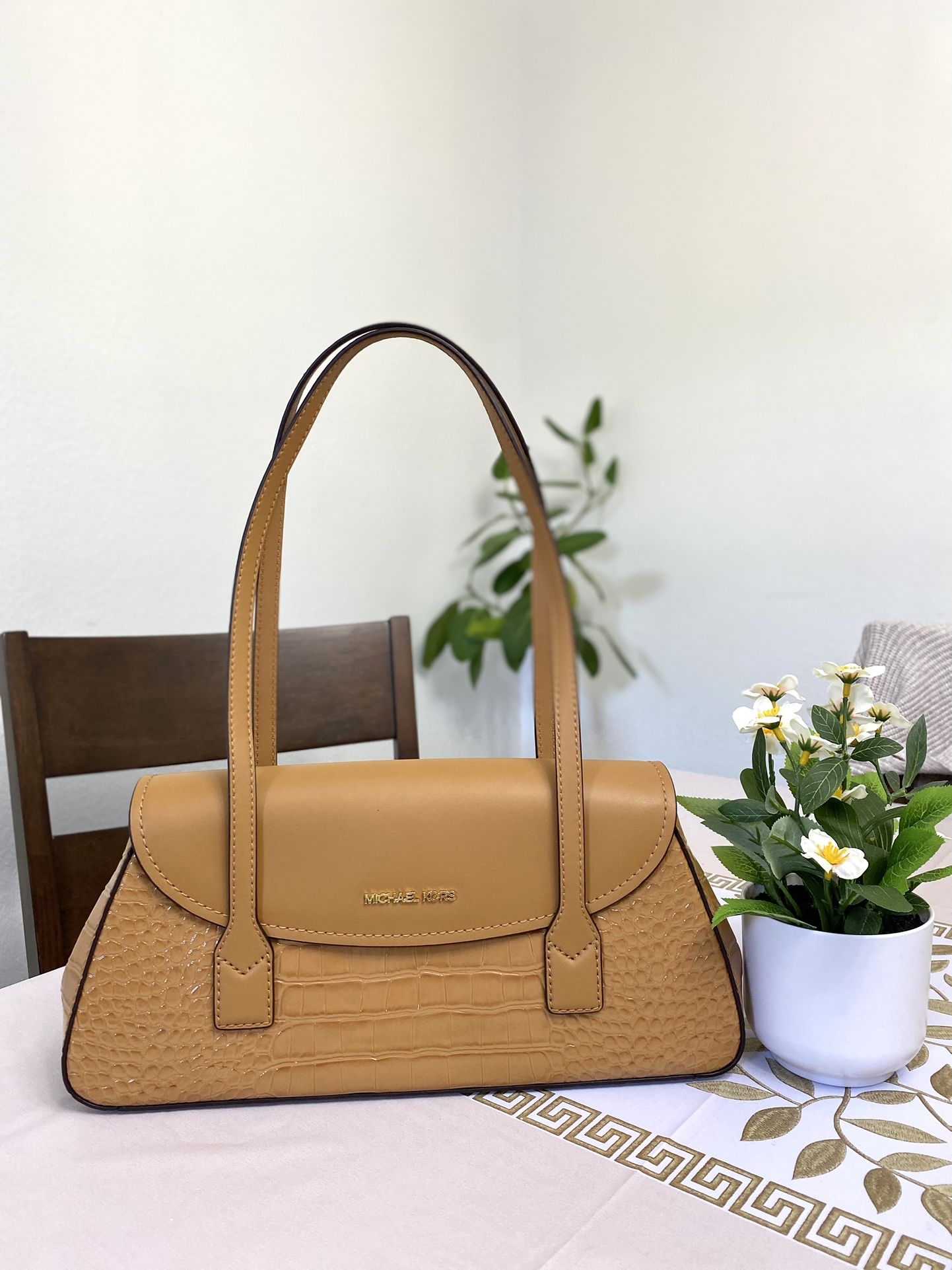 100% Michael Kors authentic guarantee and firm price ! Details •Double handles •Flap with snap closure •Interior pocket •Interior zip divider •Lined •MK logo on front flap •Gold-tone hardware •13"L X 6"H X 3"D •Imported