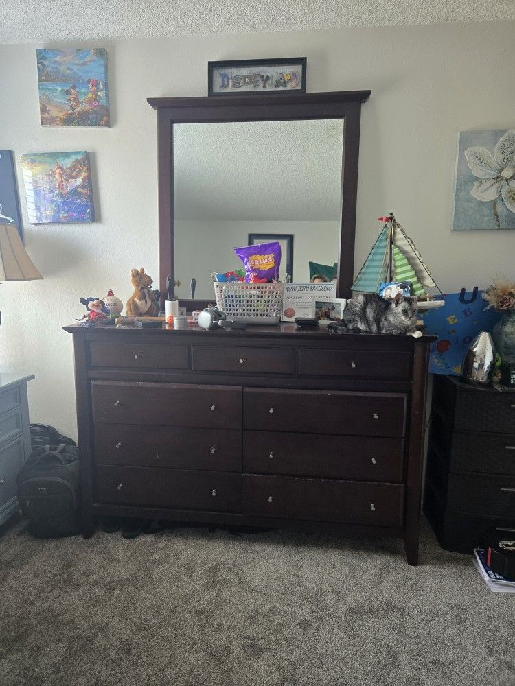 Looking for a fantastic deal on a beautiful dresser and mirror set? This is it! This used set is in very good condition and offers generous storage space with its spacious drawers, all lined with velvety felt. The dresser measures 64"x41". Our new bedroom set arrives tomorrow and this must go by 12pm tomorrow, June 25th, before the truck leaves! It's yours for just $100 or best offer. Come pick it up today!