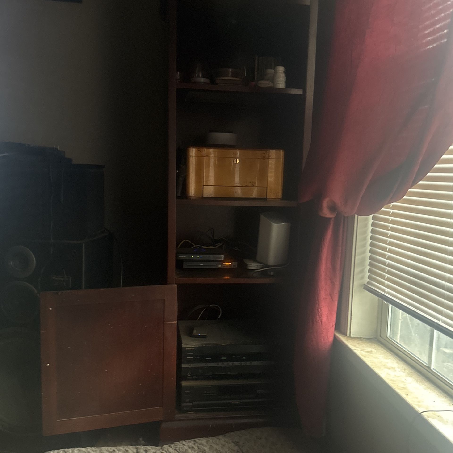 Glass shelves in mahogany finished wooden display shelving used to house my electronics. Has a show light at the apex to show off collectibles. Hate to have to sell but need part with it.