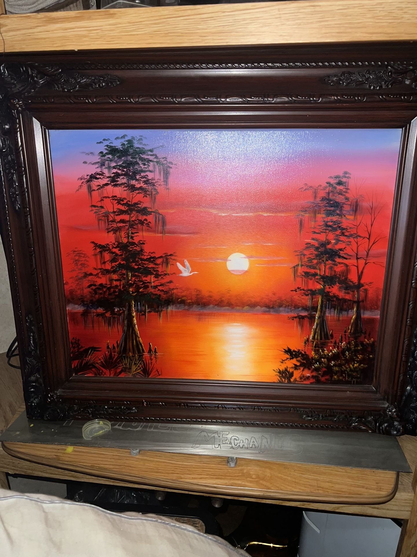 Original oil painting signed “the swamp” by chappel, was 1500$ 25 years ago. It’s beautiful in perfect condition with a frame that was 400$ alone. Trying to get as close to 2000$ as possible. This is one of one you will not find another. Original oil painting I believe it originated from Louisiana, The artist and painting I believe, it’s oil painting for more pics jus lmk ill send but it’s absolutely beautiful makes the whole room come alive