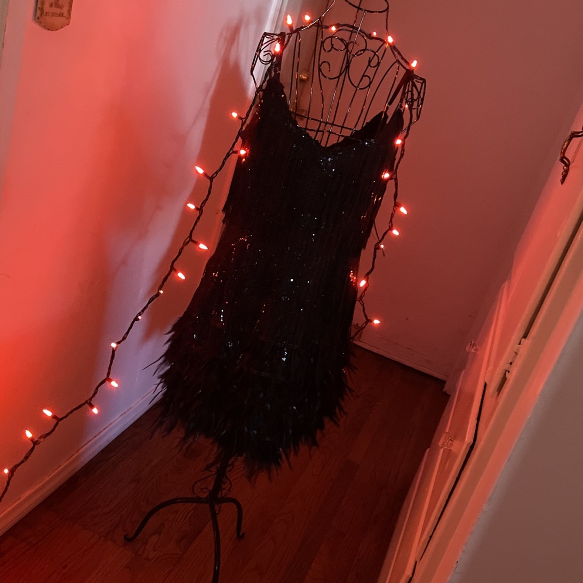 Dazzle the crowd in this brand new, Flapper Girl Dress With Black Sequined Fringe And Feathers. It also has a zipper on the back and adjustable shoulder straps. Size: Large.