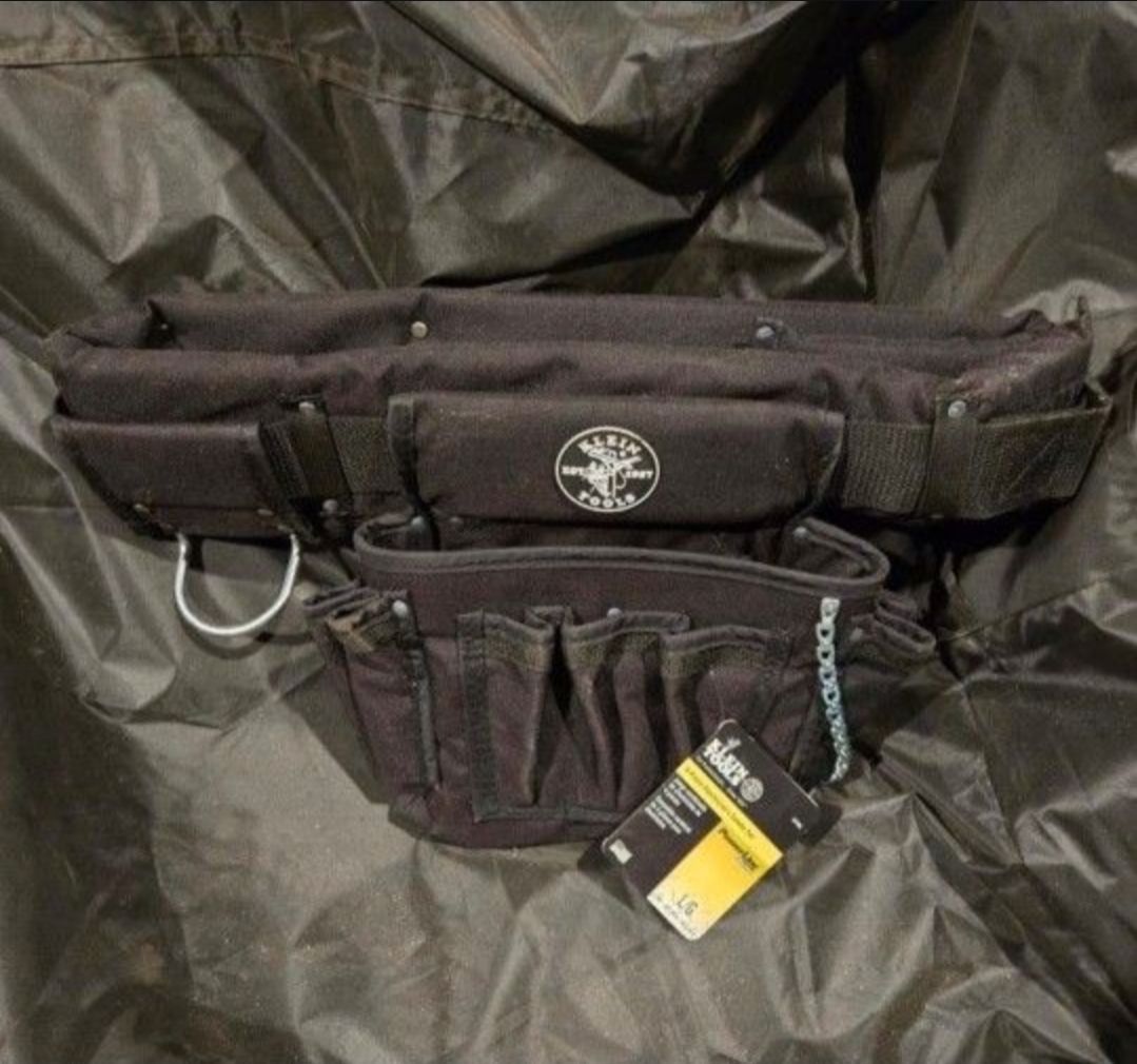 Klein Tools Electrician Tool Belt 5170L Klein tools 5170L NEW just dusty from being in garage Tool belt Size L 36" to 40" 8-Pocket Tool Pouch (Cat. No. 5718); 27-Pocket Tool Pouch (Cat. No. 5719); Hammer Holder (Cat. No. 5706); Padded Tool Belt (includes nylon web belt Cat. No. 5704)