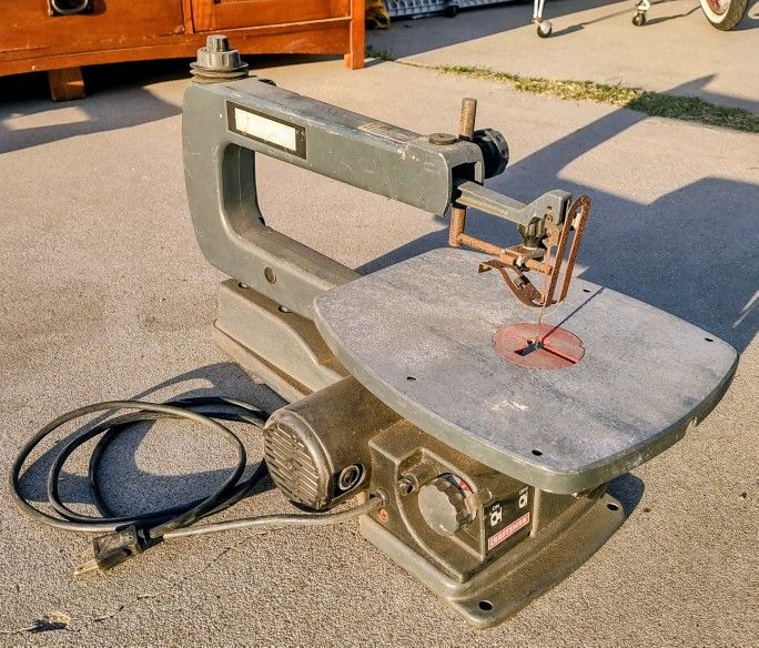 Made in USA. Model 315. Excellent condition, works great. Includes only what's shown in the pics. Corded electric scroll saw designed for detailed hobbyist projects, such as puzzle-making or fine intricate scrollwork and cutting in wood, metal, or plastic with a speed between 500 to 1700 RPM. It features a 16-inch throat capacity, allowing for detailed work. Key Features & Specifications - Model 315. Capacity: 16-inch throat, 2-inch maximum cutting depth. Speed: Variable speed motor between 500 to 1700 RPM. Blades: Uses 5-inch scroll saw blades. Weight: Approximately 42 lbs. Components: Includes a tilting table for bevel cuts and an adjustable air blower to clear dust. Usage and Maintenance - Blade Installation: Uses either pinned or plain-end blades, secured by a tensioning knob at the rear of the machine. Operation: Features an on/off switch with speed control and an upper arm that allows for easy blade changes.