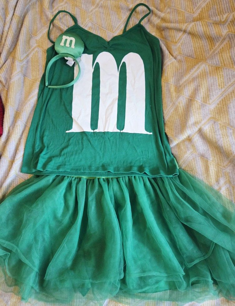 Womens green m&m costume. I used it when I was pregnant. Skirt is l/xl. Tank says 3x but I used it as maternity. $10