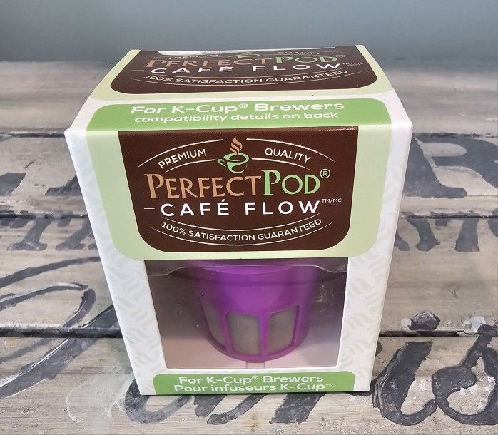 PerfectPod Cafe Flow Reusable Single-Serve Coffee Filter Cup For K-Cup Brewers (see pics for details). NIB, never used cup or filters. Color of cup is purple.