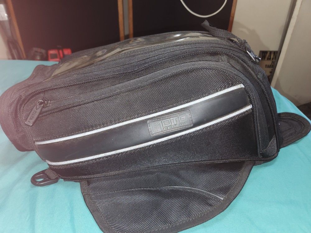 Magnetic tank bag with multiple storage areas including staps to mount it and a cover.