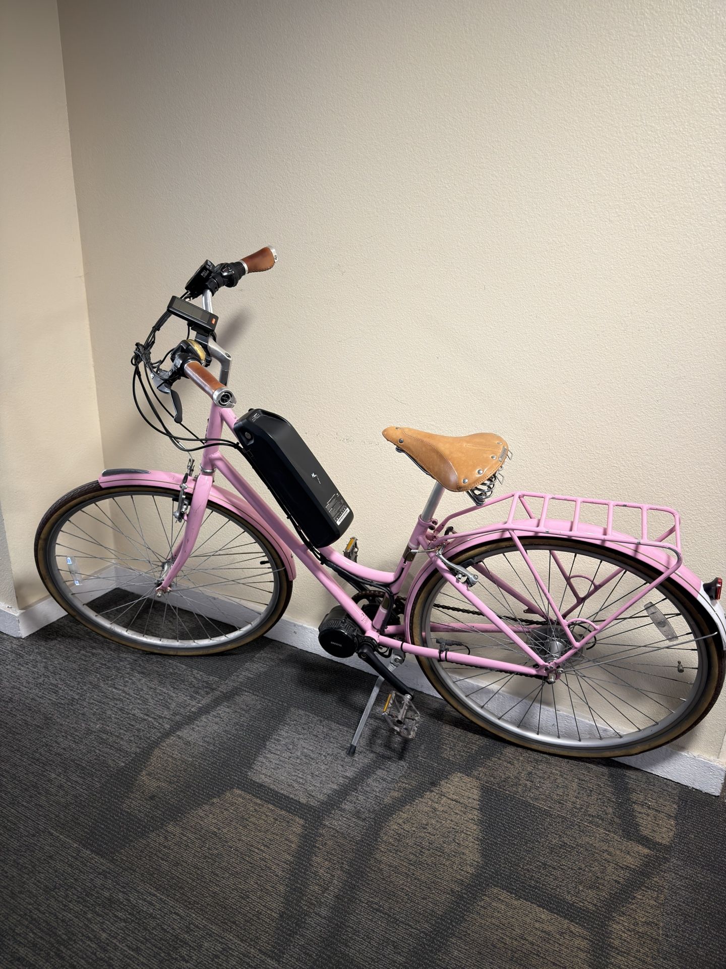 Pink Raleigh with electric upgrade. You will want to get the tires replaced for about 60-80 bucks. Normal wear and tear over the years.