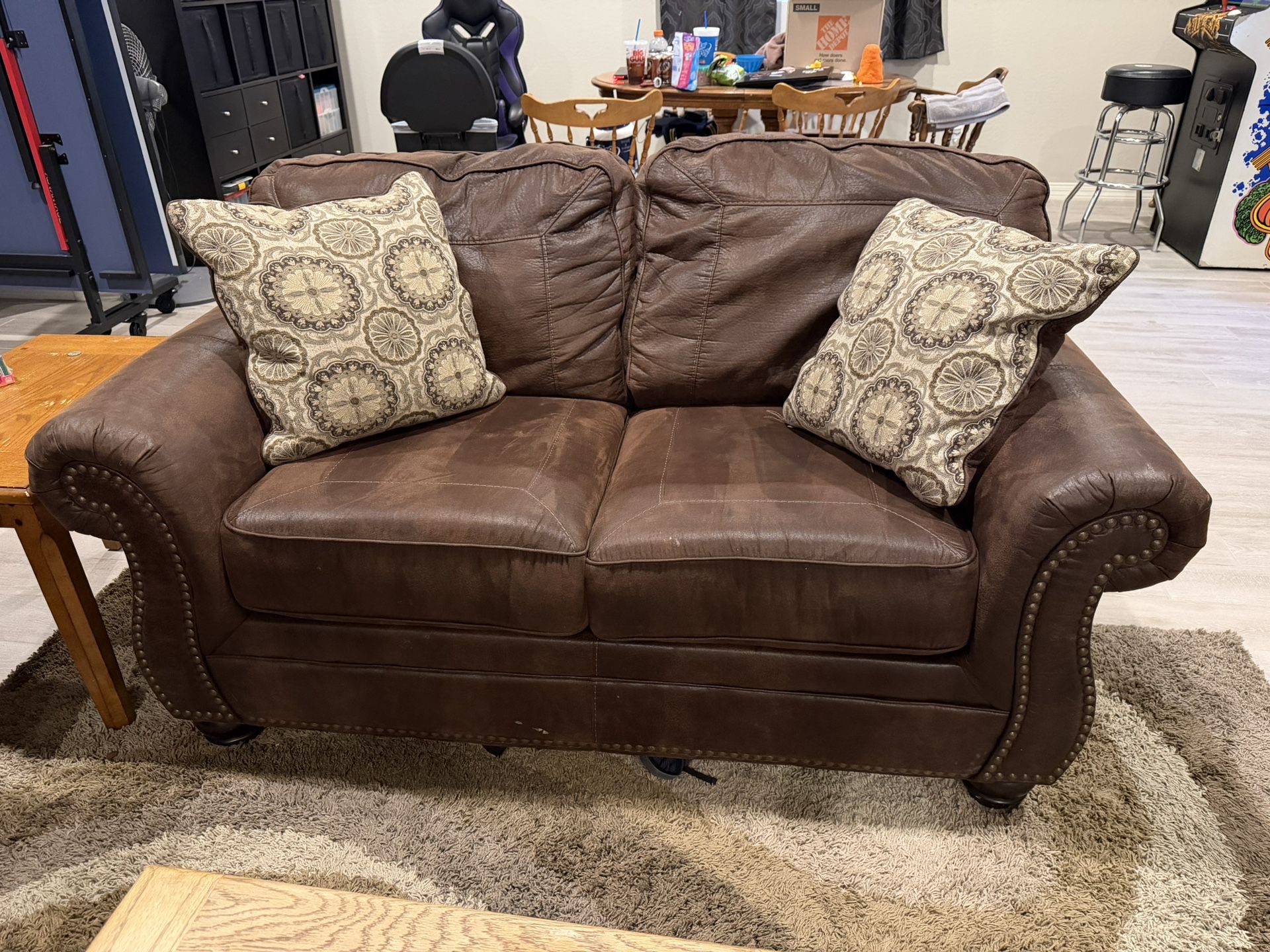 Brown suede like couch loveseat. Comes with decorative pillows. I live in Sossaman Estates and nearest crossroads are Power and Queen Creek Road. Pickup only. Need two people. Width - 4 ft Depth - 37”