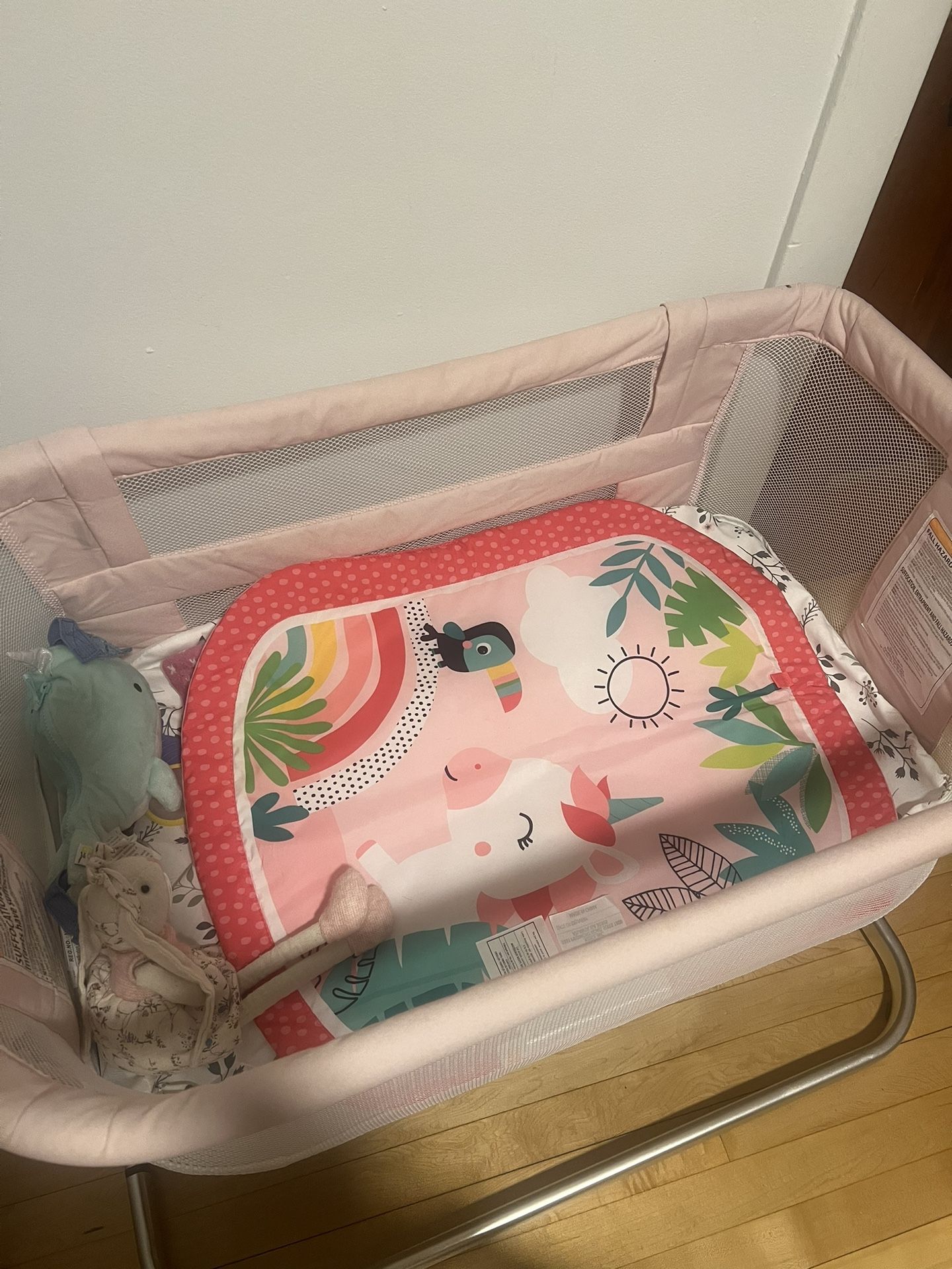 Only used about five times. It’s new and in good condition. Comes with a cushion and little accessories for a baby girl