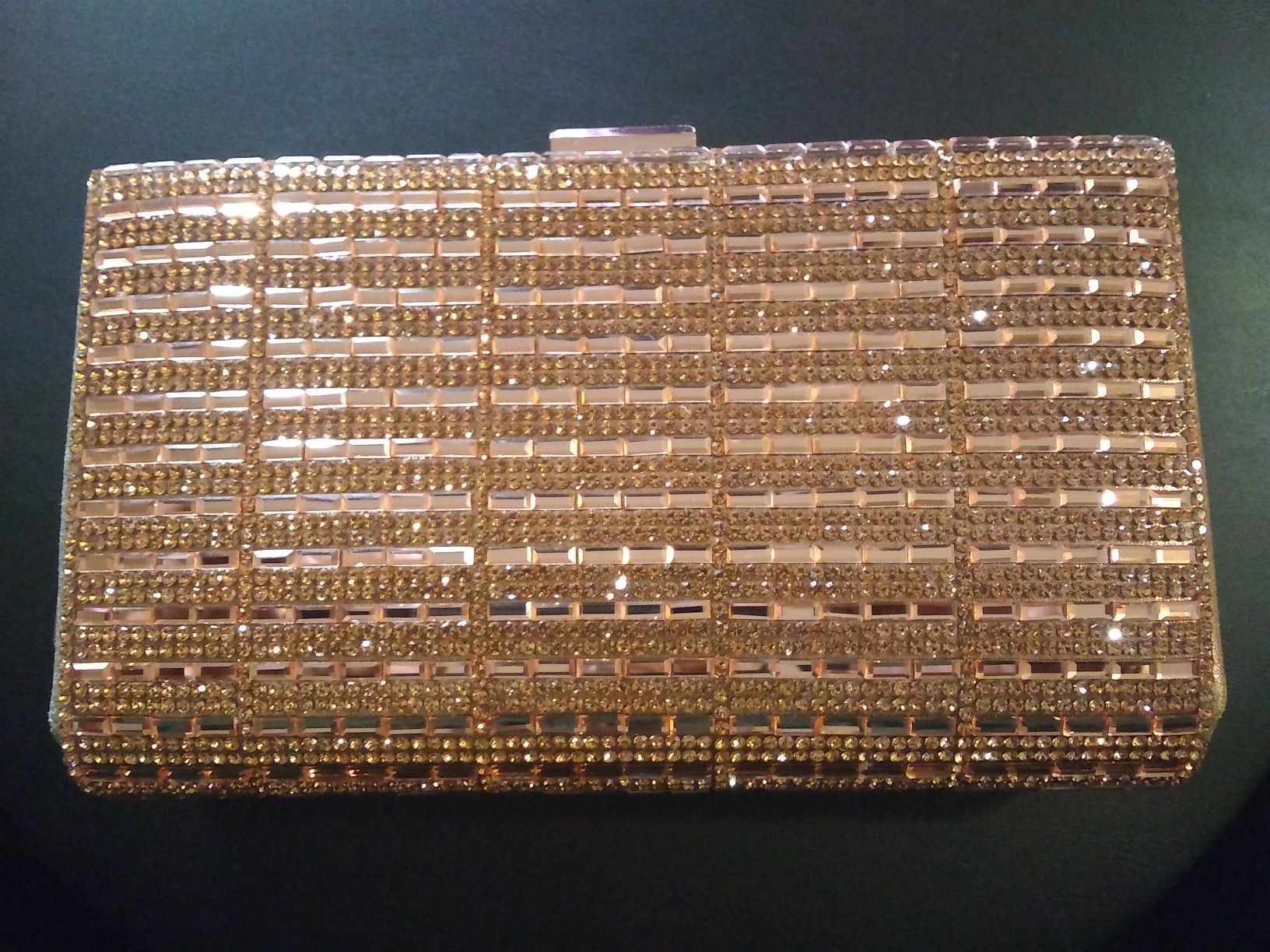Gold David's Bridal clutch purse, NEVER USED. Comes with 2 chains for carrying. One for over over the arm and one for over the shoulder. Can be used as a clutch without carry chains also.