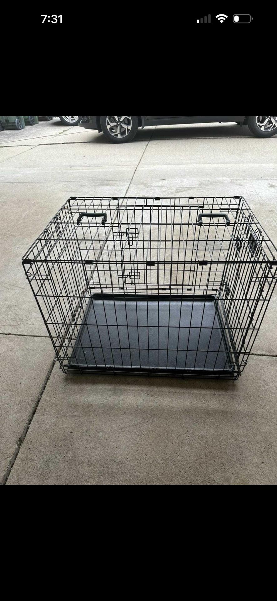 3-door dog cage. 34”high x 25”wide x 21”deep. Comes with tray. Black in color. In new condition. Price is firm. Porch pick up with cash only.