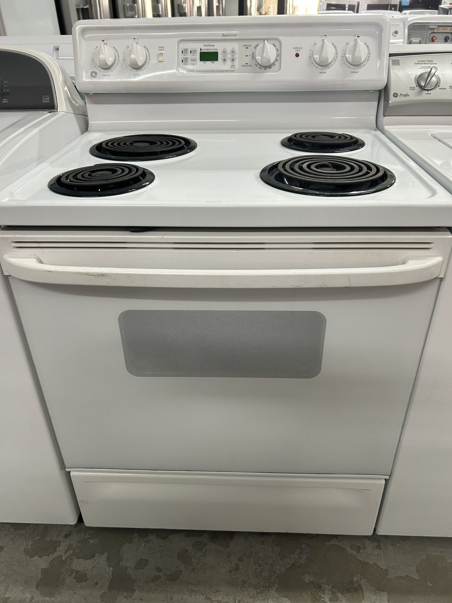 GE white self clean coil top stove. Top has 2 large burners and 2 small burners. Easy to use digital clock with one touch self clean and custom broil. Large oven with light and window in the door. Comes with warranty. Financing and delivery available.