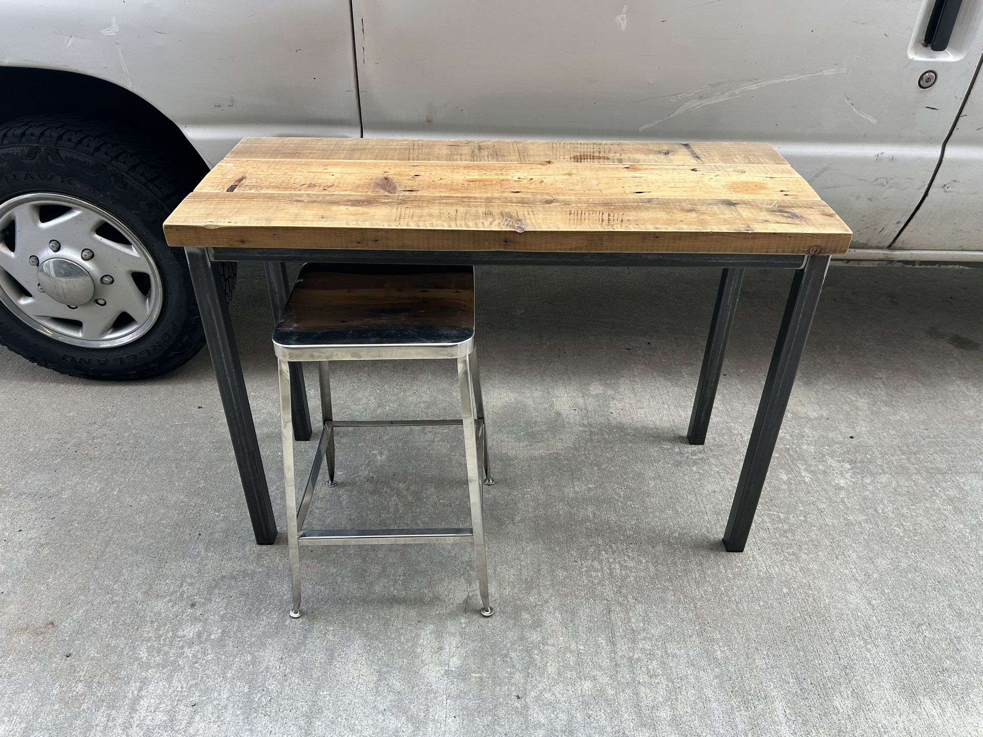 Custom-made reclaimed wood and steel bar high table. This can be used as a small eating table for a small apartment or it can be used on its own as a console table. This is not come with the souls, the stools are being sold separately, but 24 inch high stools fit perfectly underneath this table. Several more pictures available upon request. Very solid table. First come, first served. Pick up in Kearny. 43 inches wide 18 inches deep 29 7/8 inches high.