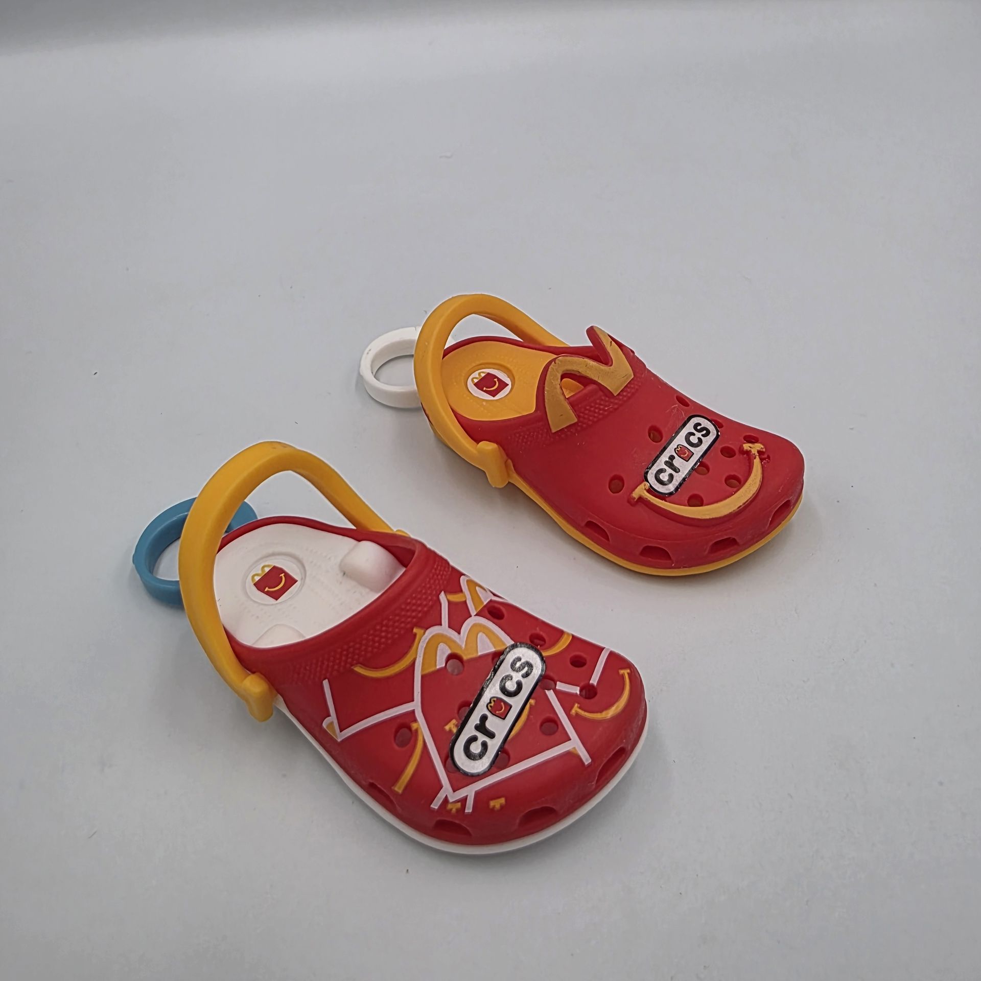 The product is a set of McDonald's Happy Meal toys in the form of Crocs clogs, with the branding and colors of red and orange reflecting the theme of restaurants and fast food advertising. Perfect for children who enjoy collecting items from fast food promotions, these toys offer a playful and colorful addition to any collection. Very good condition. No extra stickers. No box included.