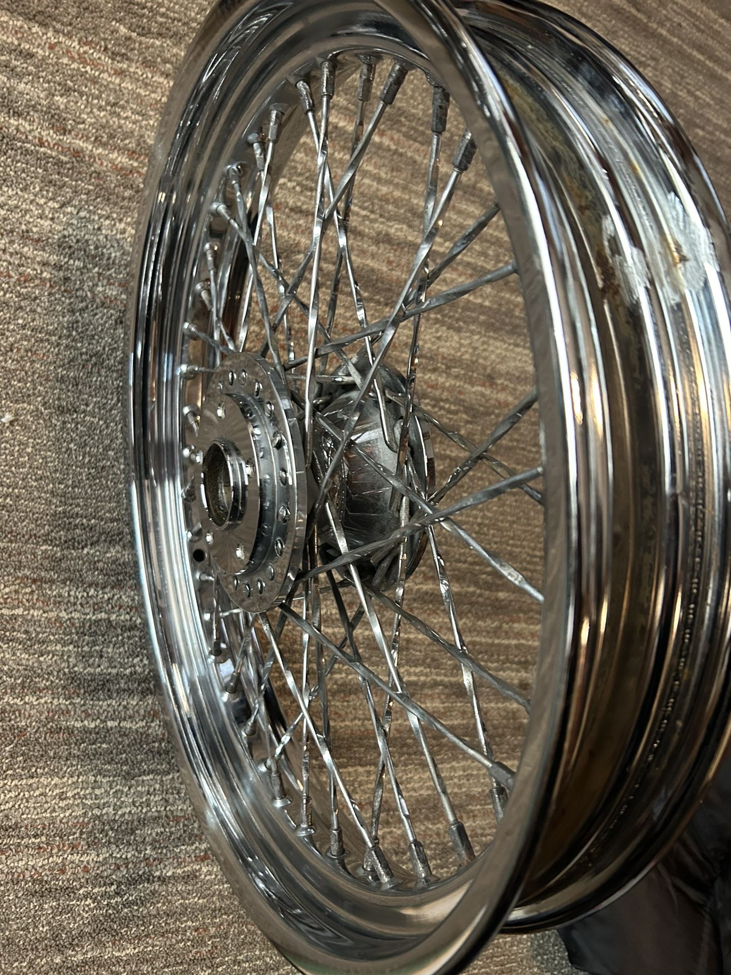 Dual Disk brake Front wheel for a chopper , bobber , or whatever else you’d like . Twisted spokes . 3/4” bearings . Needs a lil cleaning other than that a great wheel .