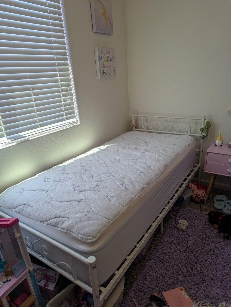 Metal frame twin bed with headboard and footboard. Doesn't require a box spring. Twin mattress purchased from American furniture warehouse. The mattress cover is only 3 months old, and the side table has a few imperfections. I also have several sets of twin sheets that can go with it. Must pick up, no delivery. Cross Streets are Power and Guadalupe. $100 for all