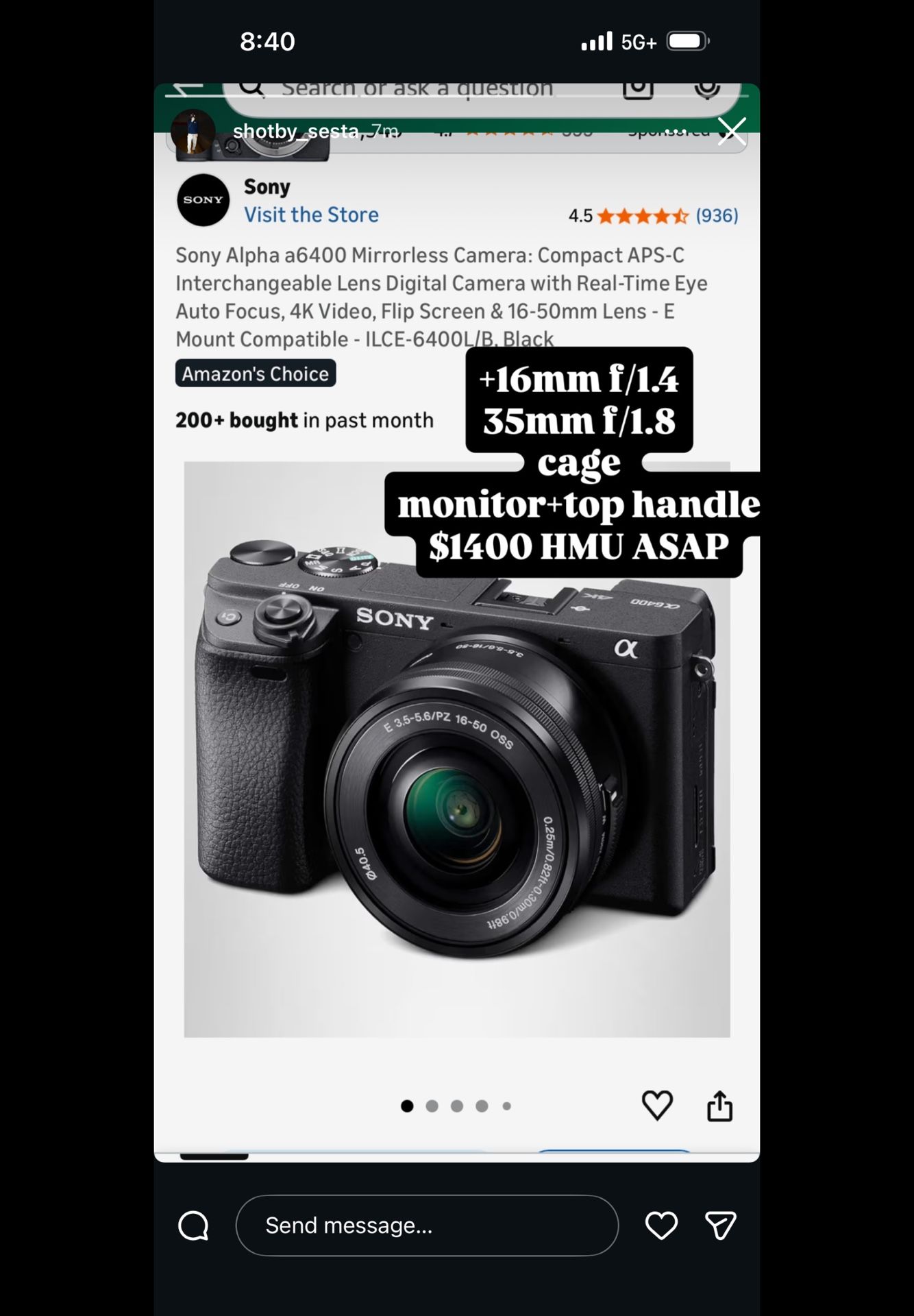 A6400 16mm f/1.4 35mm f/1.8 Cage, monitor with top handle $1,400 obo