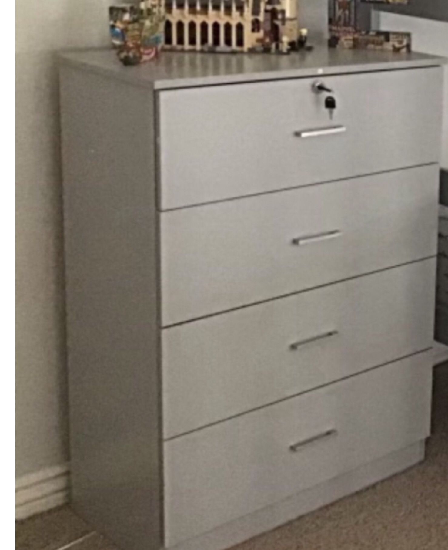 4 drawer dresser WITH LOCK Keep your belongings safe and Add a classic, simple, storage solution to your bedroom with the 4-Drawer Chest. It’s modern industrial design and clean lines will complement any decor. Profiled drawer fronts and nickeled handles help provide a timeless look. Keyed lock drawer helps keep your belongings safe from unwanted hands. Assembled dimensions: 28in. W x 41 in. H x 16 in. D Drawer dimensions: 27 in. W x 9 in. H x 14 in. D Smooth running drawer glides Safety stops to help keep the drawers secure and in place Constructed from CARB compliant, laminated composite woods Assembly required FREE DELIVERY AVAILABLE SAME DAY!!!,,,,,Assemble required