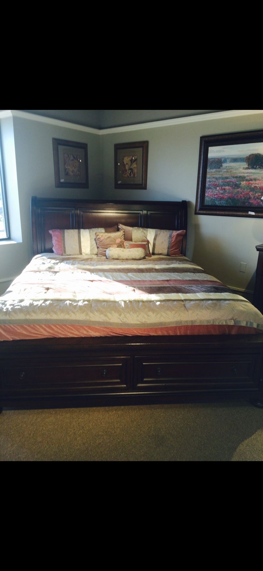 Queen size bed frame. Picture is when I first bought it. It it is moderately worn with some bumps and bangs from moves in the past. Could be fixed with some wood pens. It is currently being stored in the garage, otherwise I would post a more recent picture. $250 OBO I also have a matching dresser, wardrobe, and nightstand. $400 for full set, Pick up only.