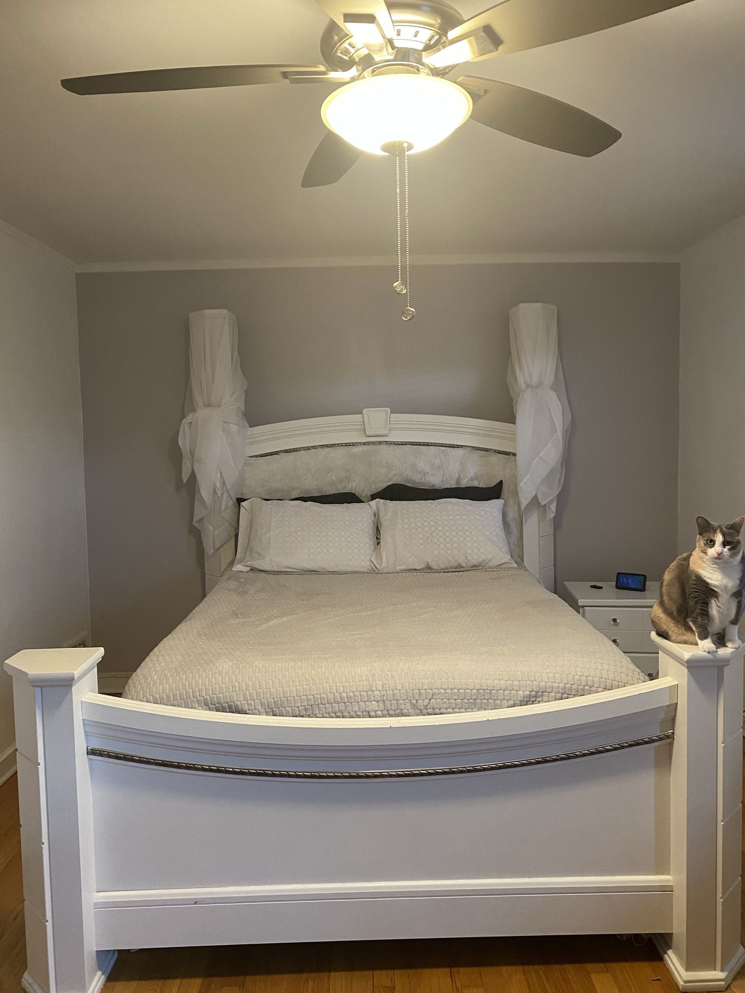 This beautiful unisex royalty. Queen size bed frame with white wood. Custom bed frame. White with silver trim and a white fur headboard. Normal wear and tear. Pick up only on the south side of Chicago. First come first serve. See you soon.