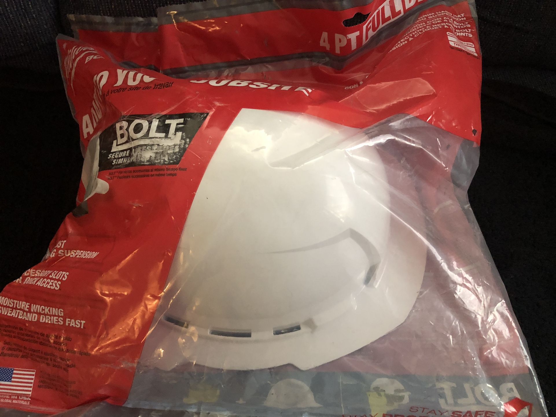 Milwaukee bolt 4 point full brim hard hat helmet. Brand new in package only $10 cash. I have only 2 left at this price of $10 each.