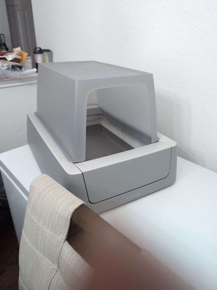 Used for 5 months only. Sitting around in storage 3 years as my cat had long passed. Found that I'm now allergic to cats after having a kid and can no longer possibly get one in the future. So looking to get rid of the litter box she had. It is cleaned up and functioning, however, there is a bit of purple staining on the bottom tray from a color indicator litter that was once used. Pick up only.