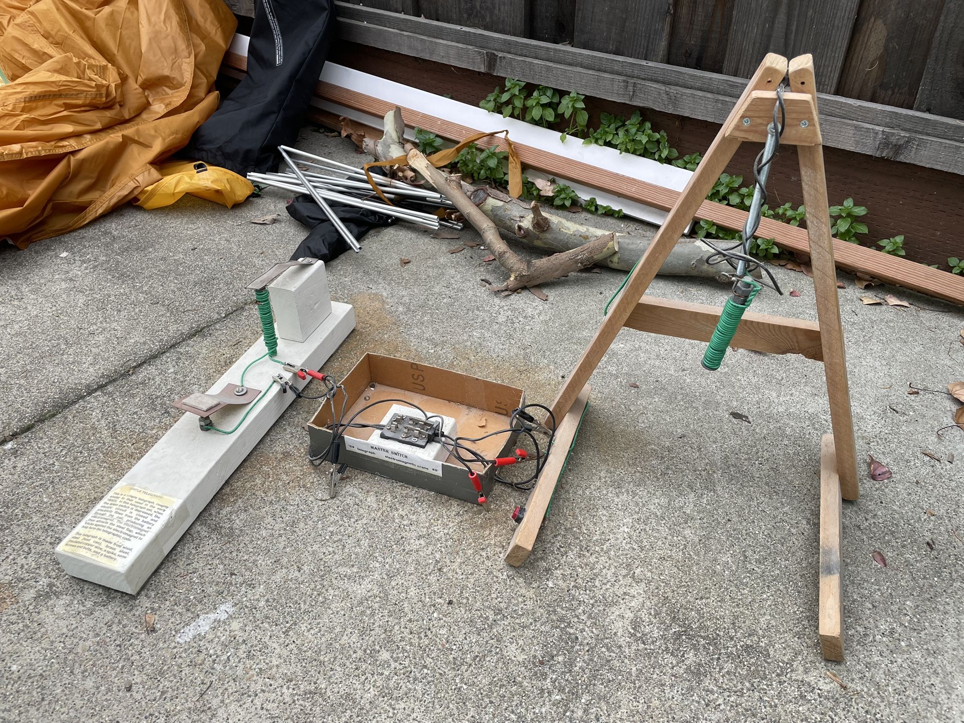 Built this toy for a science fair 20 years ago. It works well, both the simple telegraph and the hand operated crane, but it needs a new battery. I recommend at least three 6 volt lantern batteries, could be connected in series or parallel. The more batteries, the better the thing will work. Since it’s a low current dc battery operated device, it is 100 percent safe even up to several tens of volts. When operating, the telegraph taps out Morse code, and the crane can pick up lightweight ferrous objects, paper clips, etc. can be used to determine whether an object is magnetic or not. Might keep your kids entertained for an hour or so. Science kids may like it more.