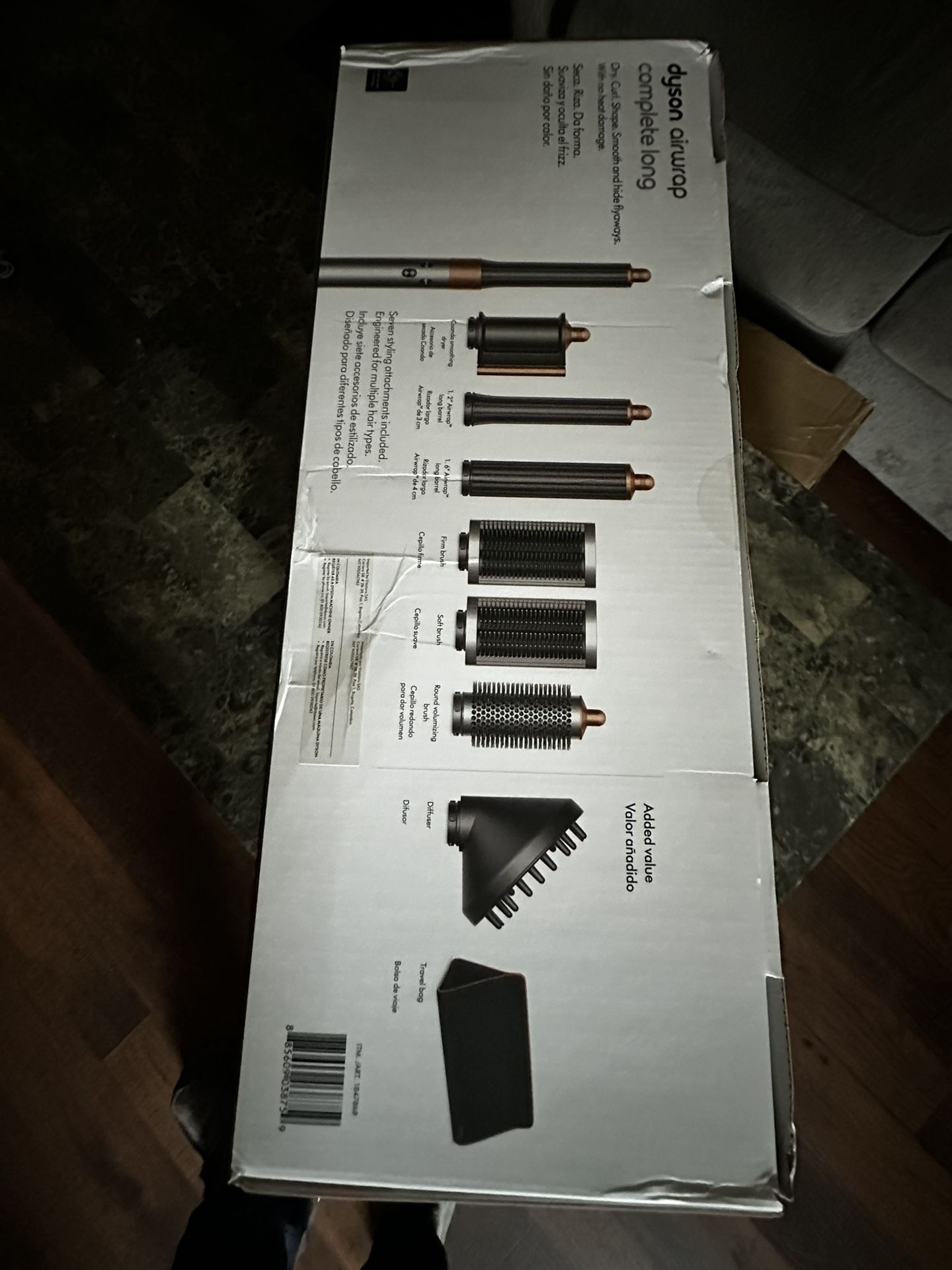 The item is the Dyson Airwrap multi-styler Complete Long. It uses the Coanda effect and air pressure to style hair without extreme heat. The package includes seven styling attachments and a travel bag. It is engineered for multiple hair types and lengths. The styler offers three precise airflow speeds and three precise heat settings.