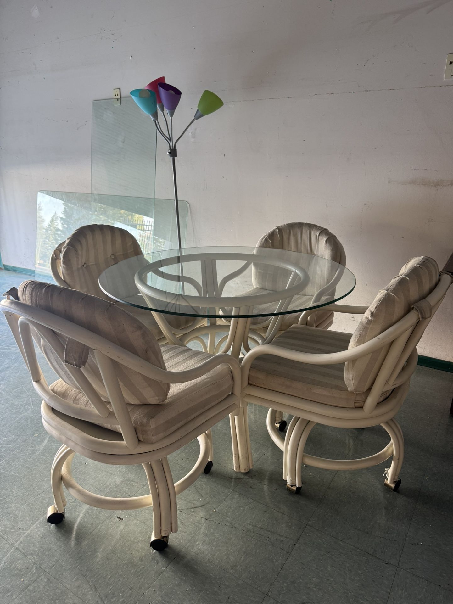 Nice dinning table, 4 seater seats have cushions glass is thick great for a small family