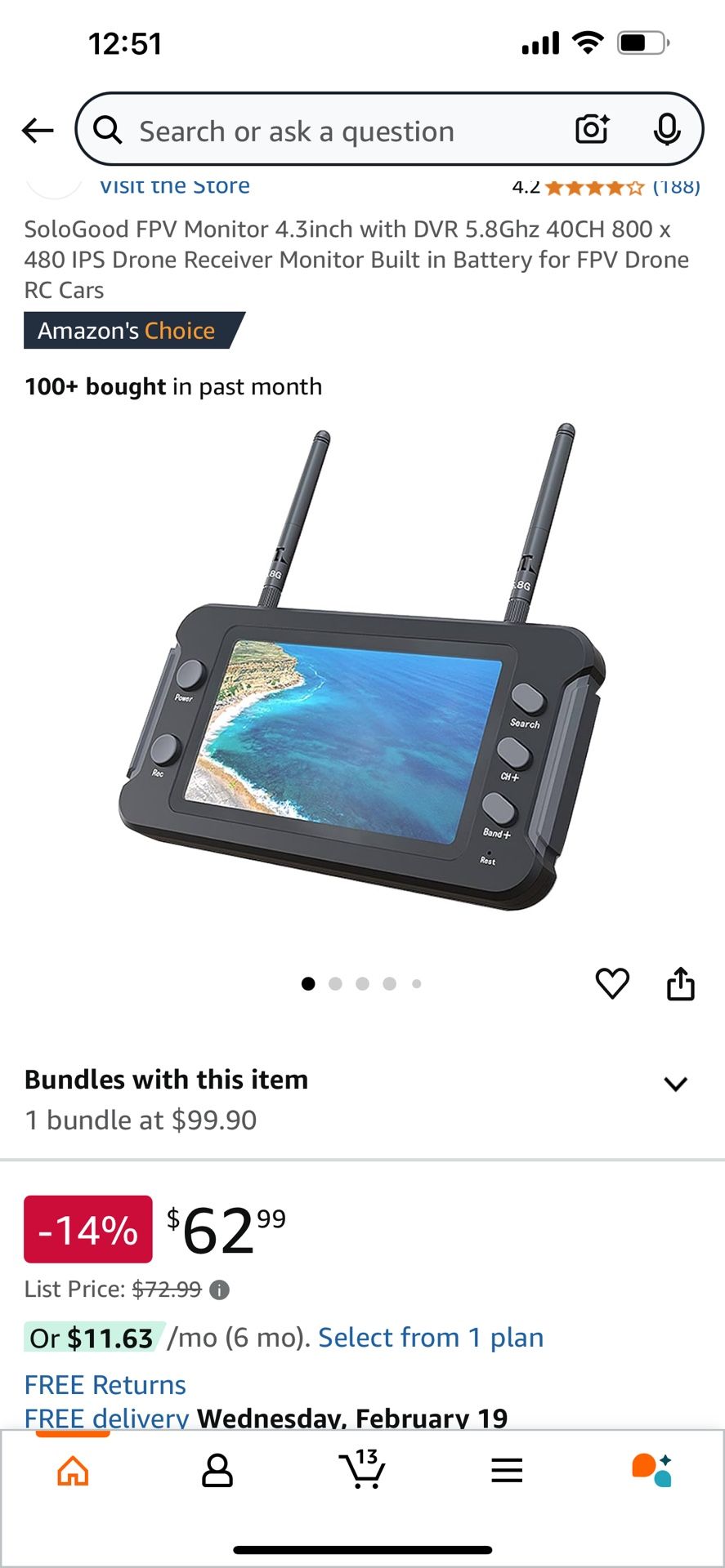 SoloGood FPV Monitor 4.3inch with DVR 5.8Ghz 40CH 800 x 480 IPS Drone Receiver Monitor Built in Battery for FPV Drone RC Cars