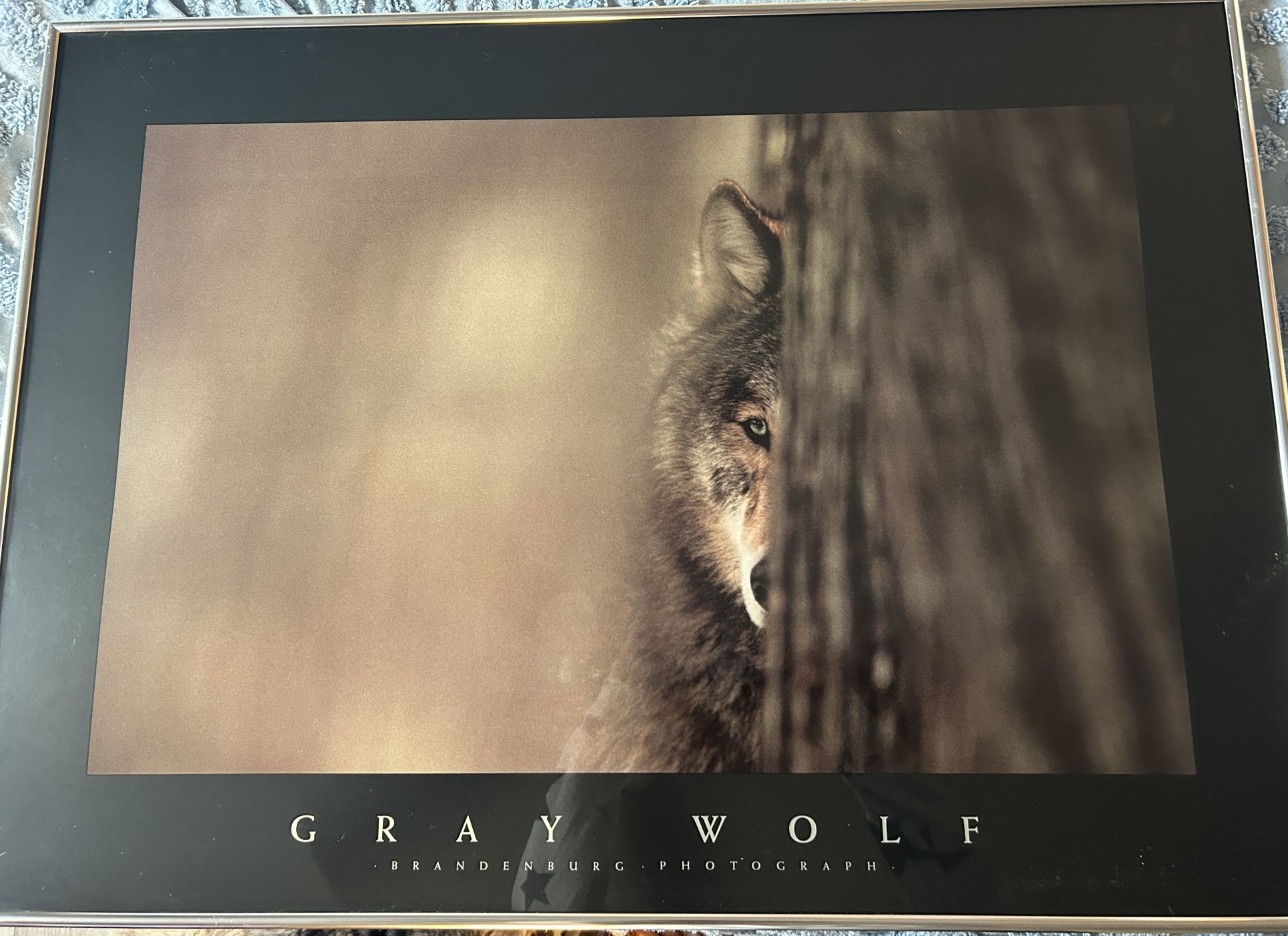 The image is a framed art print titled "Gray Wolf" by photographer Jim Brandenburg. This iconic photograph, also known as "Brother Wolf," is one of Brandenburg's most famous works, capturing a wolf peering from behind a tree. 33x24