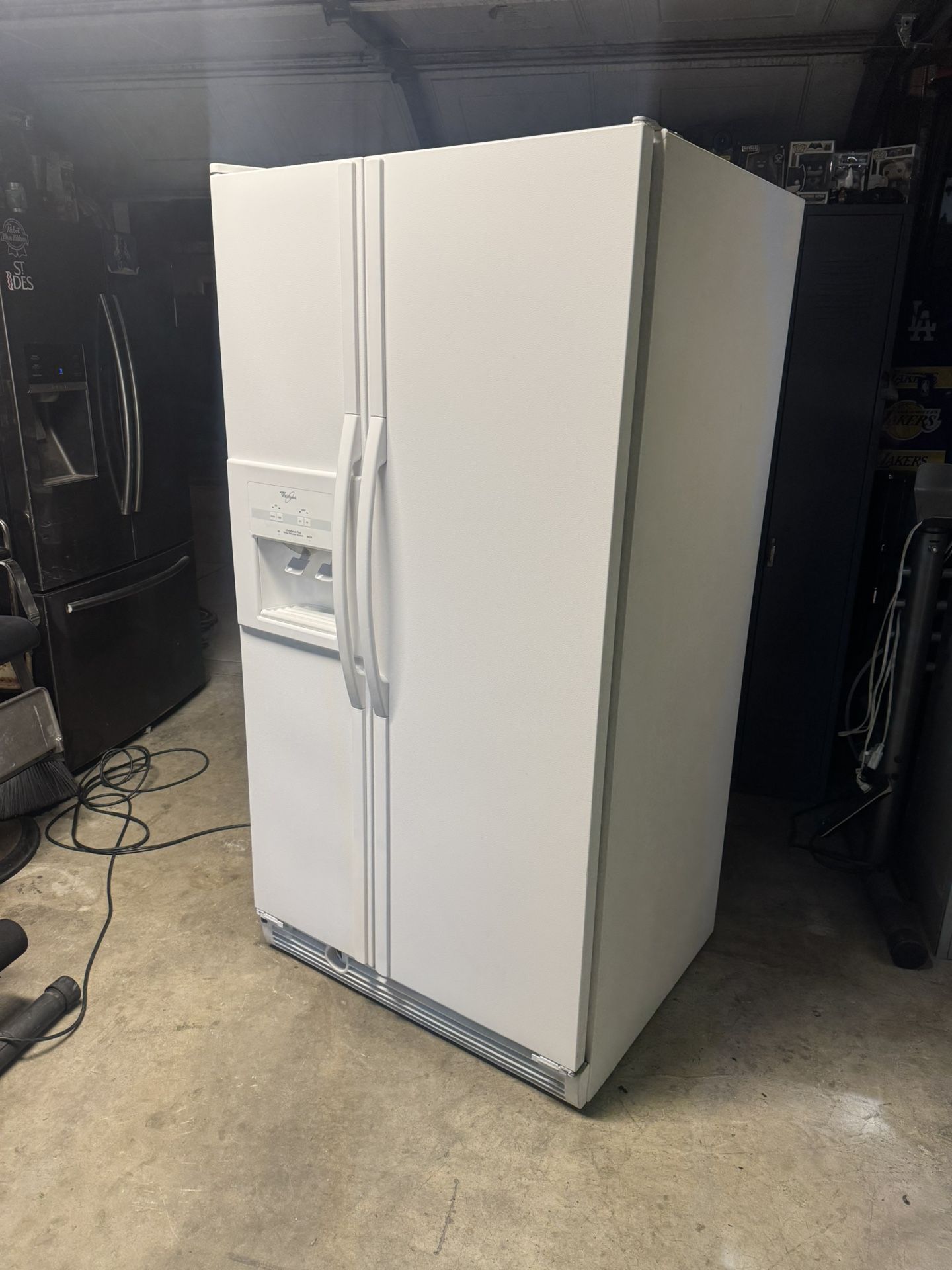 Whirlpool French door fridge in good condition with normal wear. Works perfect freeze/cold no issues. Ice doesn’t work. Missing ice box n bottom freezer drawer. Everything else perfect. Cleaned out ready for instant use. Measurements in pics. FREE LOCAL DELIVERY IF PURCHASED AT LISTED PRICE or pickup in bellflower by Golden Corral