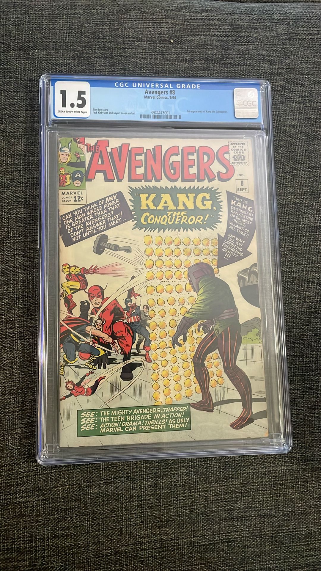Avengers #8 (Sept. 1964) – First Appearance of Kang the Conqueror CGC Graded 1.5 (Fair) This issue marks the debut of Kang the Conqueror, one of the Avengers’ most iconic villains and a central figure in Marvel’s time-travel storylines. Written by Stan Lee with art by Jack Kirby and cover inks by Dick Ayers, this is a foundational Silver Age key that helped define the direction of Marvel’s evolving universe. The 1.5 CGC grade reflects heavy wear and age, but the comic remains complete and unrestored. Pages are off-white to cream. Ideal for collectors looking to own a piece of comic history at an entry-level price. A raw but significant milestone issue in early Marvel continuity, featuring the full origin of Kang.
