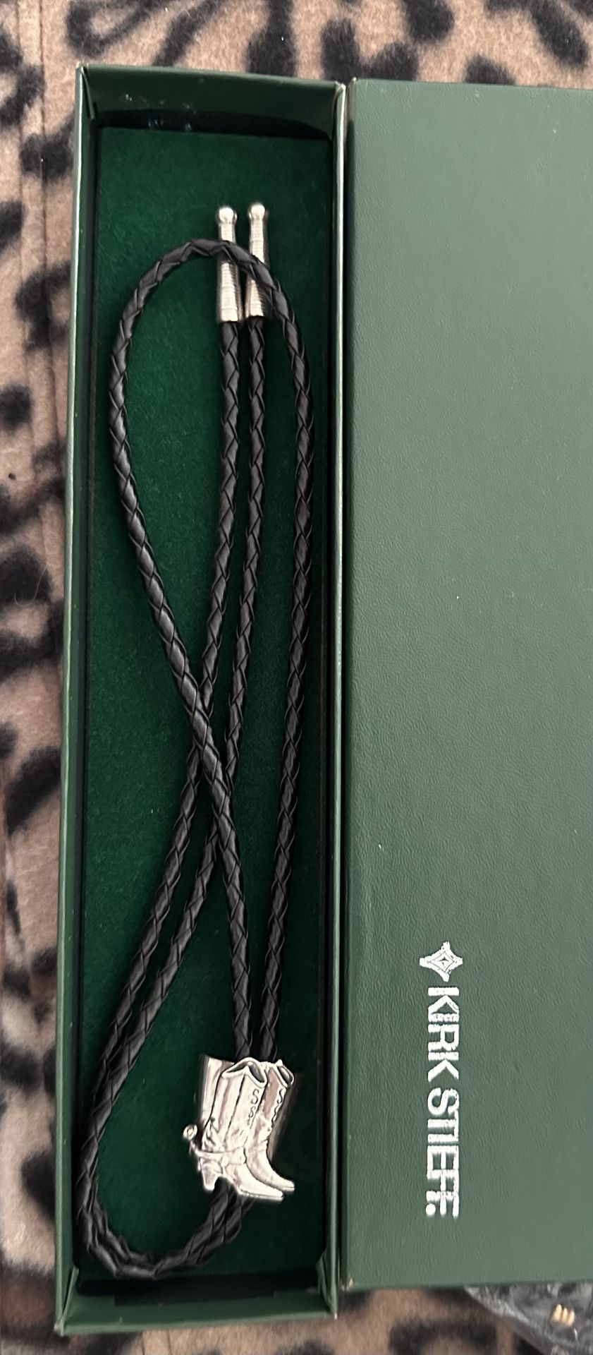 This Kirk Stieff bolo tie features a decorative slide shaped like cowboy boots on a braided leather cord.