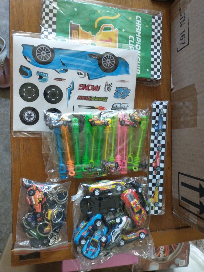 72 piece race car party favors bags, cars, bracelet, bubbles, stickers, keychain 12 of each *new*