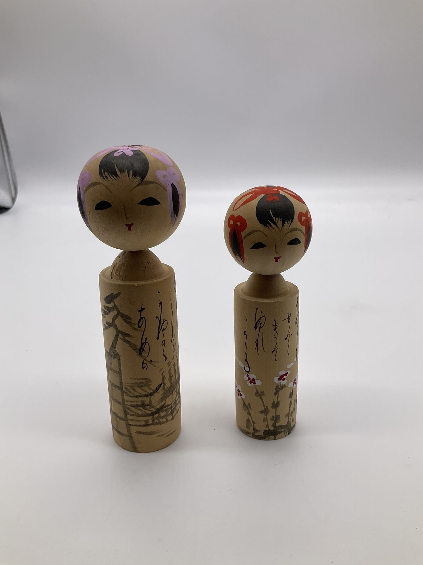 SHIPPING ONLY TWO VINTAGE WOOD JAPANESE KOKESHI DOLLS The larger doll has a few marks on her head that look more pronounced in the pictures than in real time Both Vintage Kokeshi Dolls from Japan are in good preloved condition